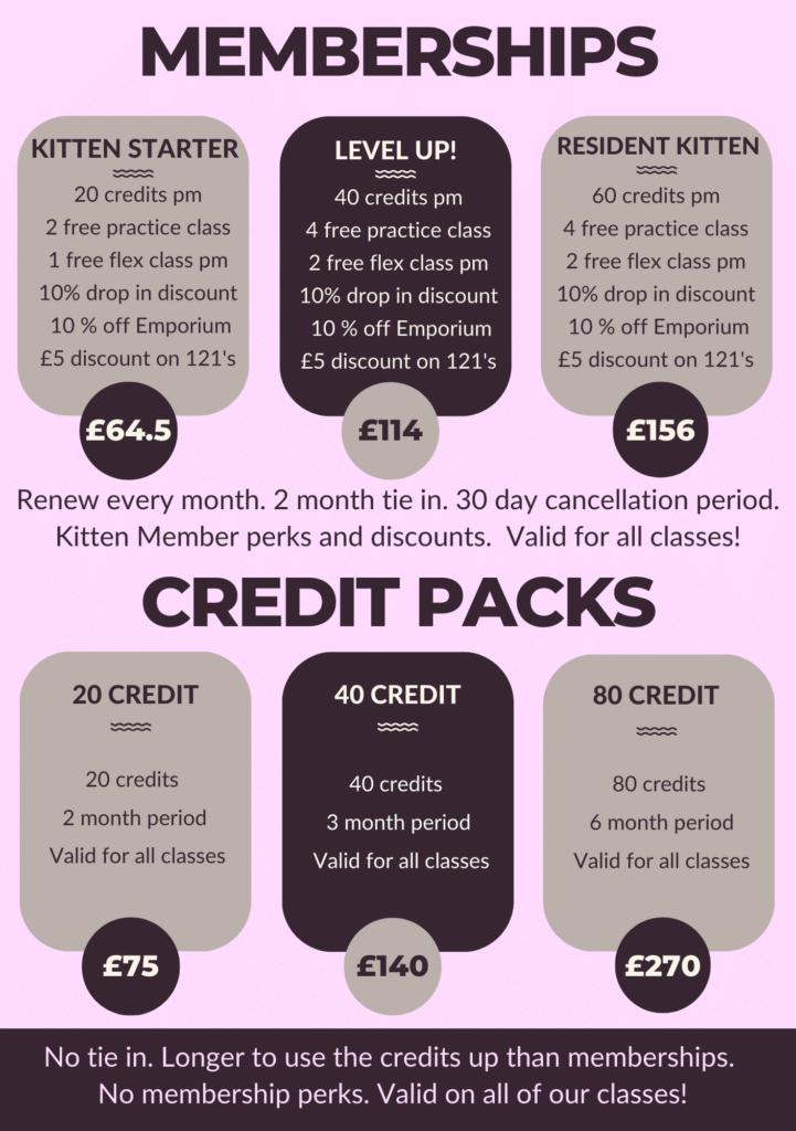 If you want to save money we have class passes on offer AND for the die hard Kitten we offer monthly memberships which give you access to cheaper classes, bolt-on upgrades, Pink Kitten Emporium discounts on shoes and pole wear, photoshoots and early bird access to intensive days.