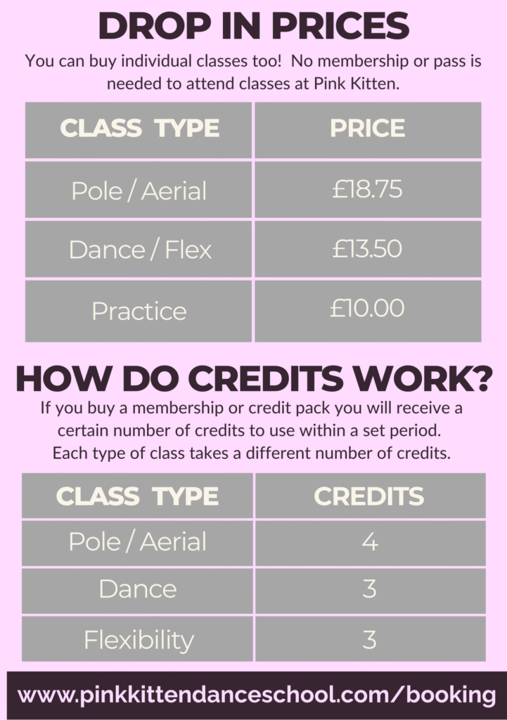 You do not need a membership to take singular classes at Pink Kitten. Just register your details with our online booking system and make a one off payment when you click on your desired class.